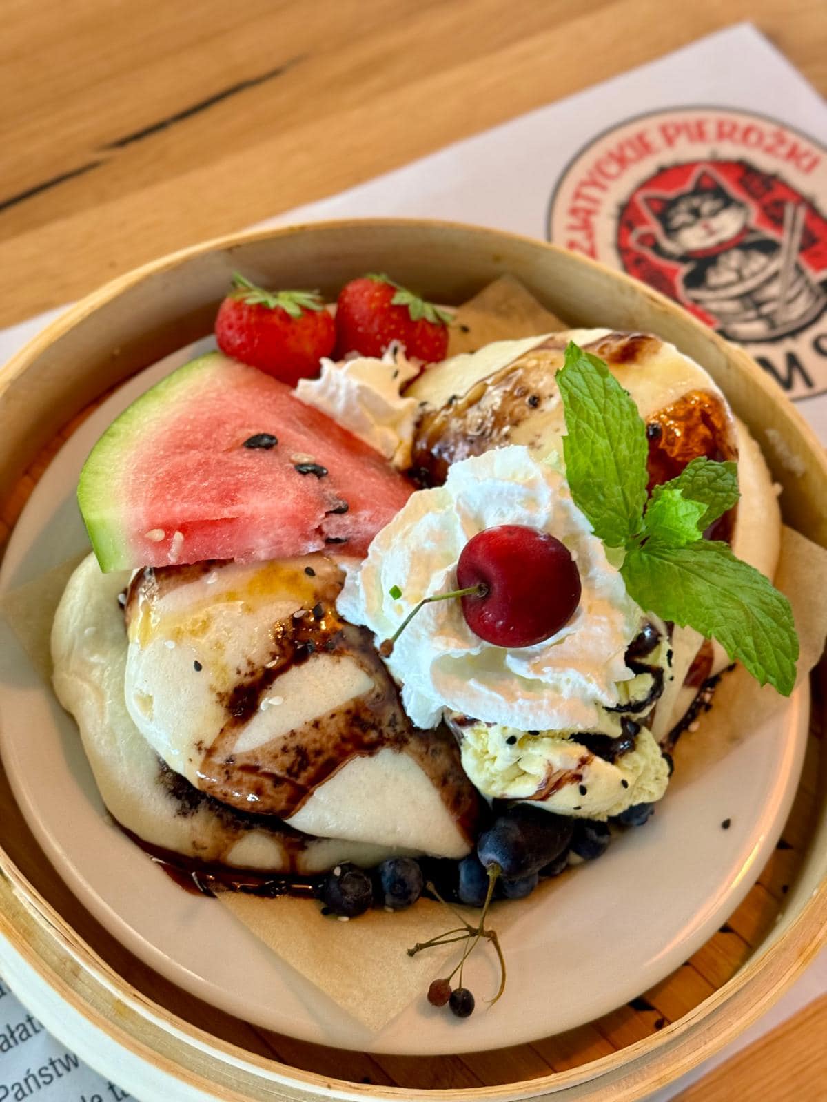 Słodkie Baozi20złPuszyste bułeczki drożdżowe (3szt.) z nadzieniem z marakui i kokosu, podawane z dressingiem czekoladowo-karmelowym, gałką lodów i świeżymi owocami