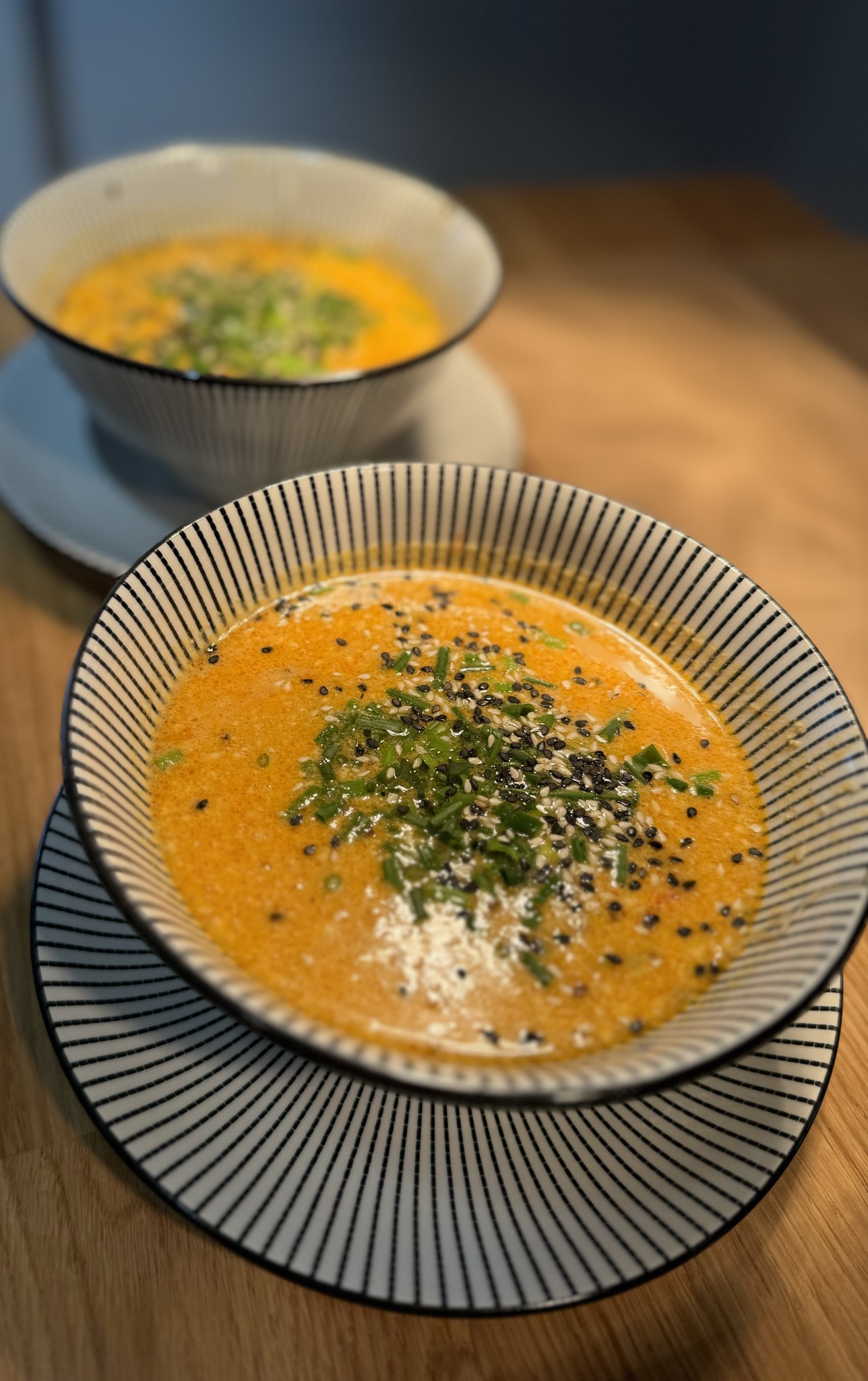 Tom kha z łososiem 🌶26złBulion z mleczkiem kokosowym, łosoś (80g), makaron ryżowy, kolendra